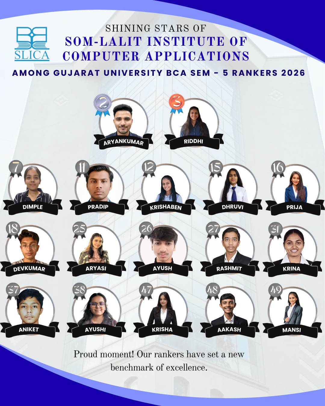 With immense pride and joy, we celebrate the outstanding achievement of our BCA Semester – 5 Rankers (2026) of Som-Lalit Institute of Computer Applications (SLICA) under Gujarat University.